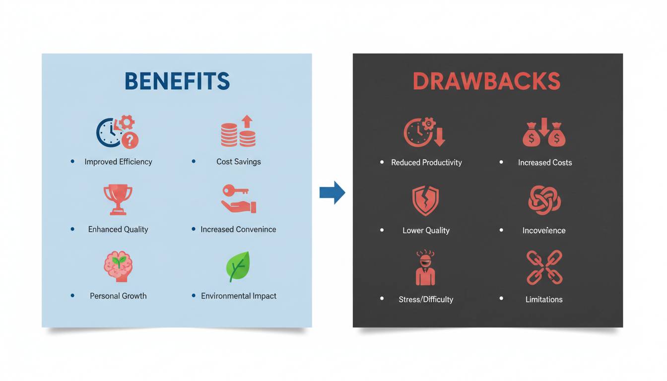 Drawbacks represent the disadvantages, costs, or negative consequences. Like benefits, they can be concrete (higher prices, longer commute times) or abstract (stress, uncertainty).
